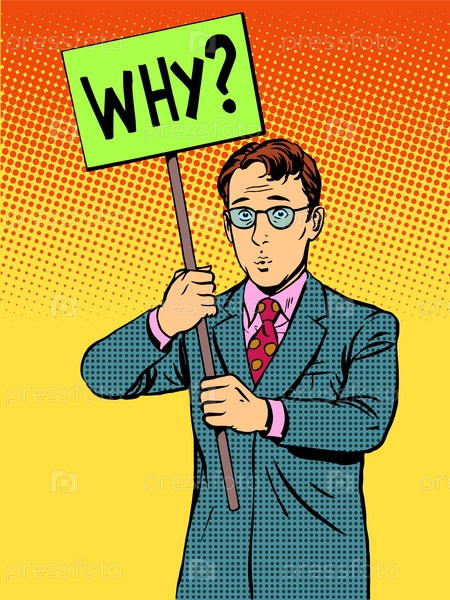 Бизнесмен держит табличку с надписью "почему"