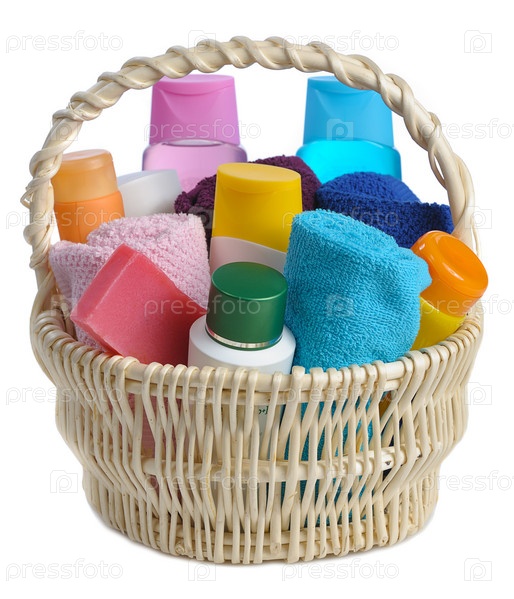 Набор туалетных принадлежностей в корзине на белом фоне