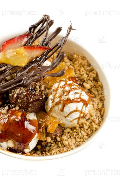Мороженое с шоколадом, карамелью и орехами