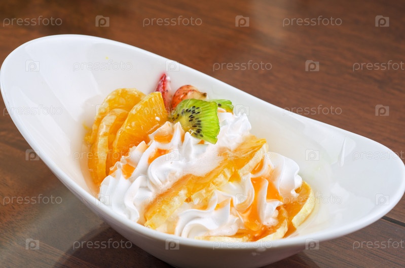 Мороженое с фруктами и взбитыми сливками