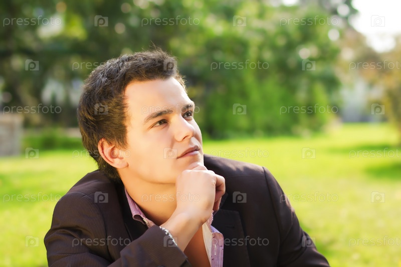 Задумчивый взгляд молодого человека в пиджаке на зеленом фоне леса