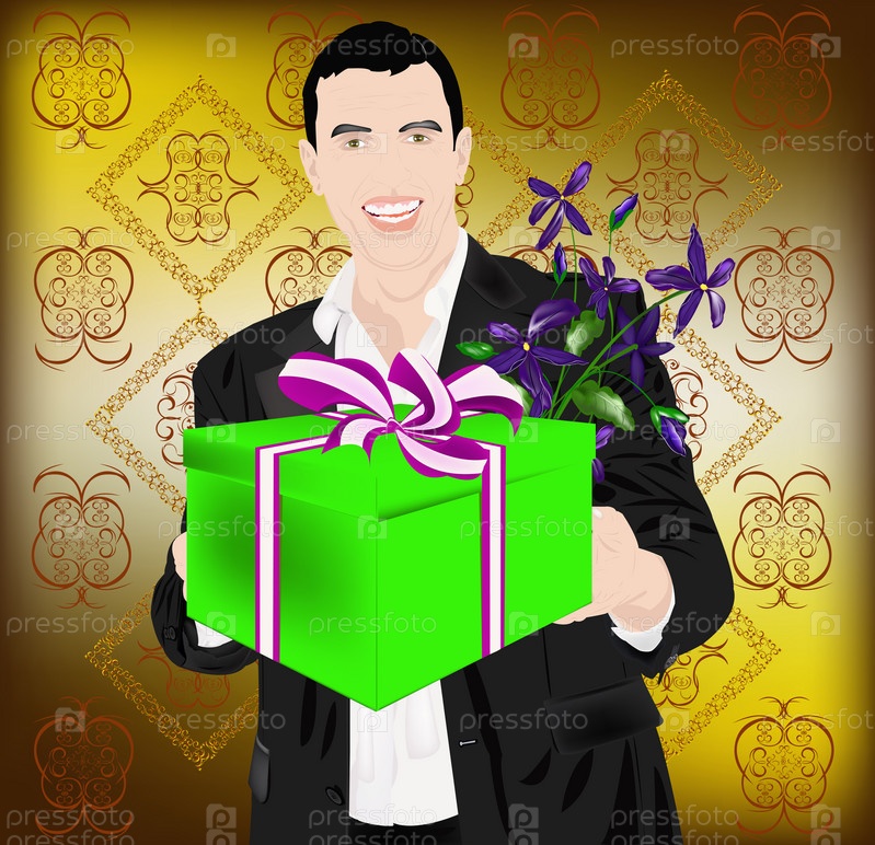 Праздничный подарок и букет цветов от элегантного мужчина