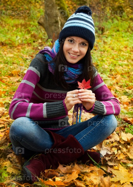 Красивая девушка в осеннем парке с кленовым листком в руке