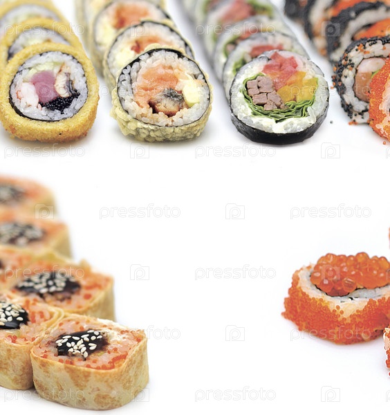 Роллы в ассортименте на белом фоне