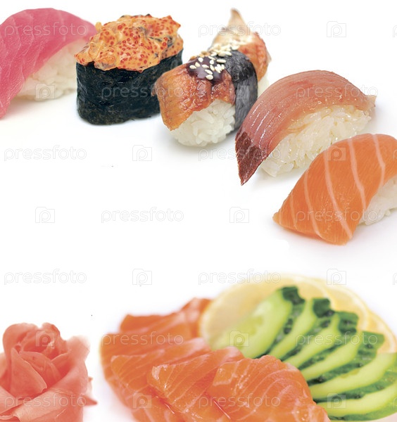 Суши в ассортименте на белом фоне