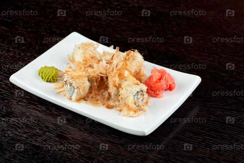 Суши из риса, нори, сливочного сыра, авокадо, копченого лосося, огурца и тунца