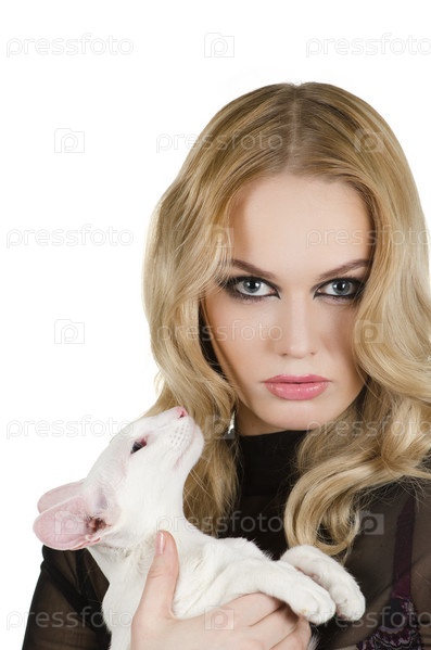 Молодая блондинка с восточной короткошерстной кошкой, на белом фоне