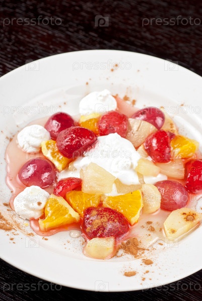 Фруктовый салат из ананаса, винограда, апельсина и клубники со взбитыми сливками