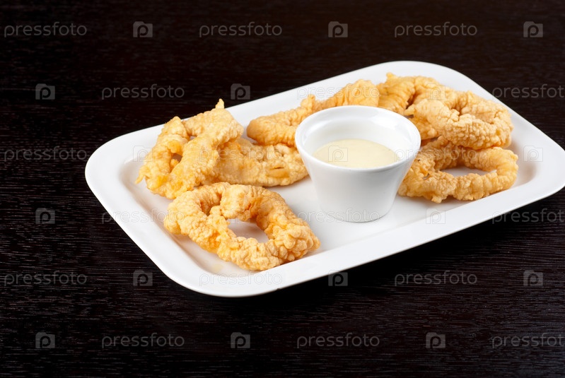 Жареный кальмар с соусом на белой тарелке