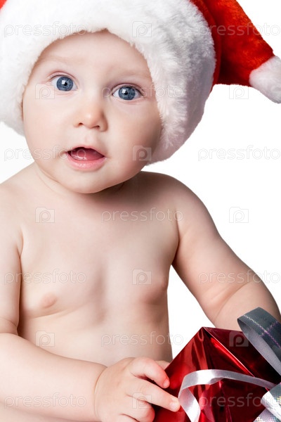 Портрет милого мальчика, одетого в шляпу Санты и смотрящего на камеру