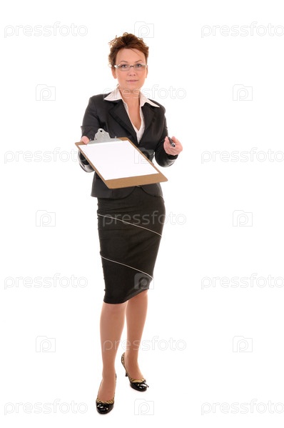 Серьезная женщина с папкой-планшетом в руке