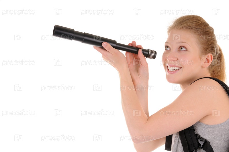 Привлекательная молодая женщина с рюкзаком смотрит через телескоп