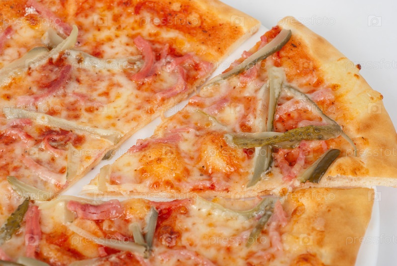 Пицца с колбасой, ветчиной, маринованными огурцами и сыром моцарелла