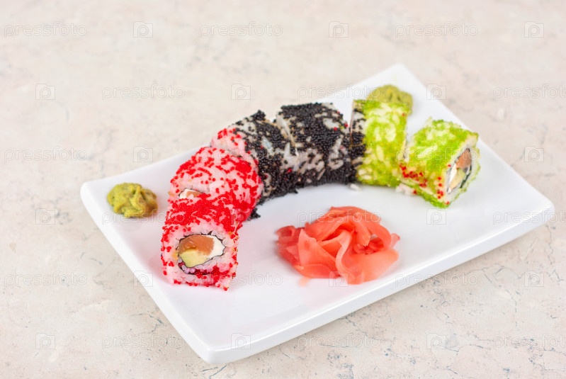 Суши из лосося, авокадо, тобико и сыра филадельфия