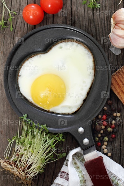 Жареное яйцо в сковороде в форме сердца с кресс-салатом, помидорами, чесноком и перцем