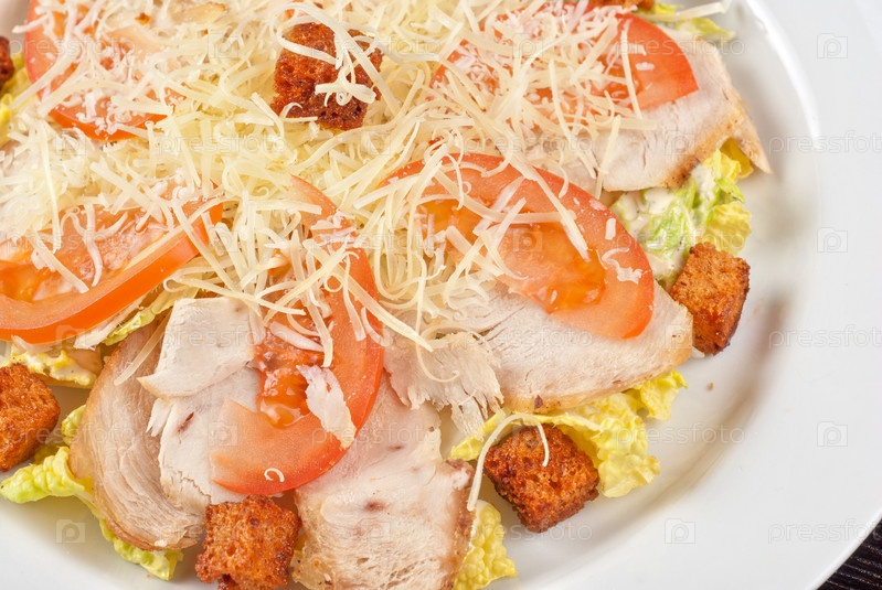 Салат из пекинской капусты, помидоров, чесночных сухарей, пармезана, соуса и куриного мяса