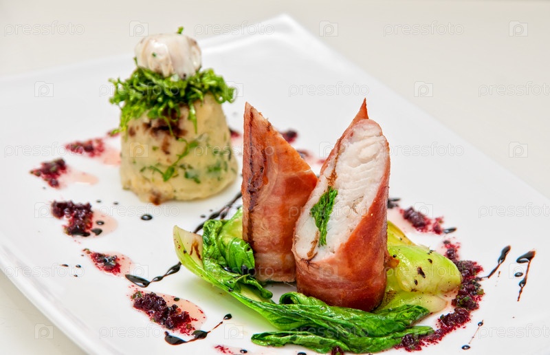 Судак с беконом, базиликом, укропом, петрушкой, перцем и перепелиным яйцом