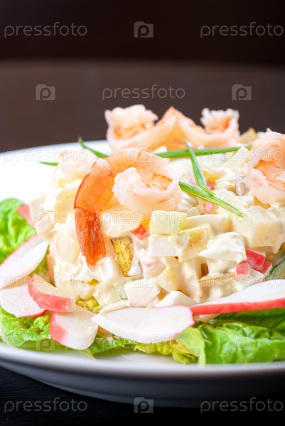 Салат из креветок, мяса краба, огурцов, яблок, картофеля, кукурузы, яйца и майонеза