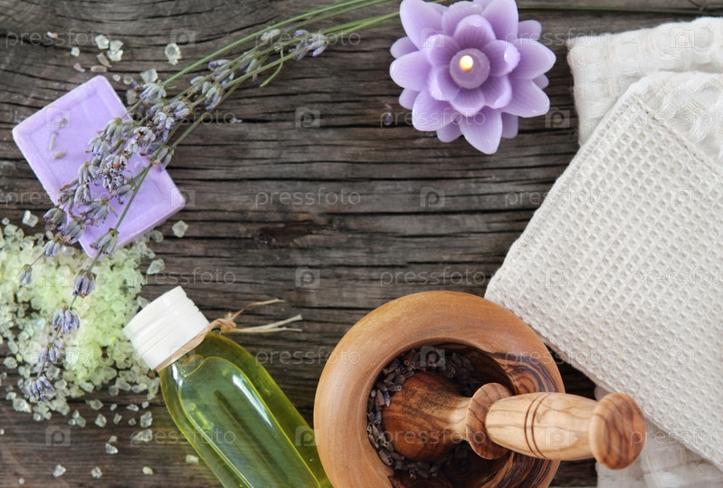 Лавандовый спа с эфирным маслом на деревянной фоне