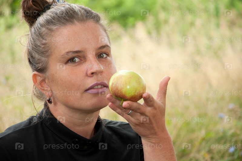 Женщина в поле с яблоком в руке