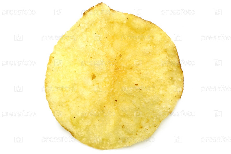 Тонкий ломтик обжаренного картофеля крупным планом на белом фоне