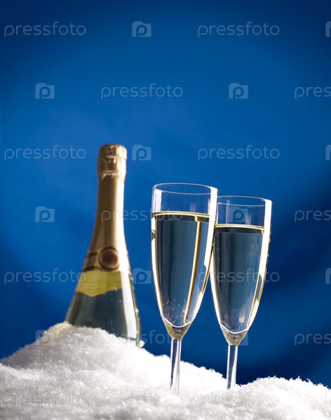 Изображение флейты с шампанским и бутылкой в снегу на синем фоне