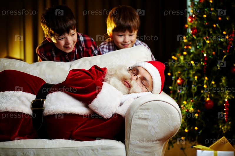 Дети подглядывают, как Санта Клаус спит на диване