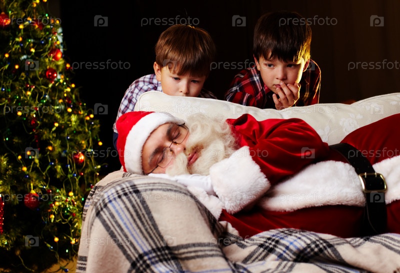 Дети подглядывают, как Санта Клаус спит на диване