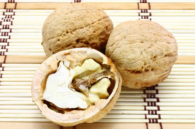 Расколотый пополам грецкий орех с двумя целыми на бамбуковой скатерти