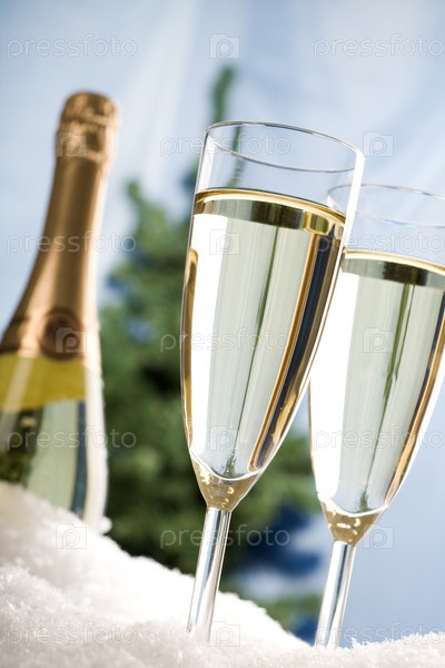 Близкий план полной флейты шампанского, охлаждающейся в снегу с бутылкой на заднем плане