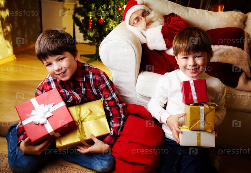 Счастливые братья с подарками на фоне спящего Санты