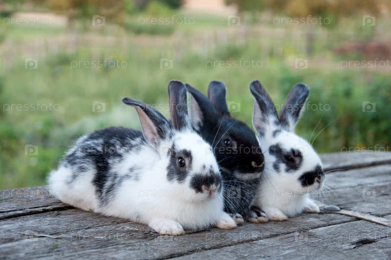 Три маленьких кролика на деревянном столе в саду