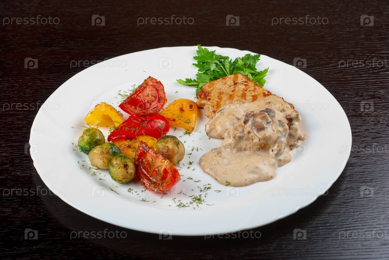 Стейк из свинины с грибным соусом и овощами гриль