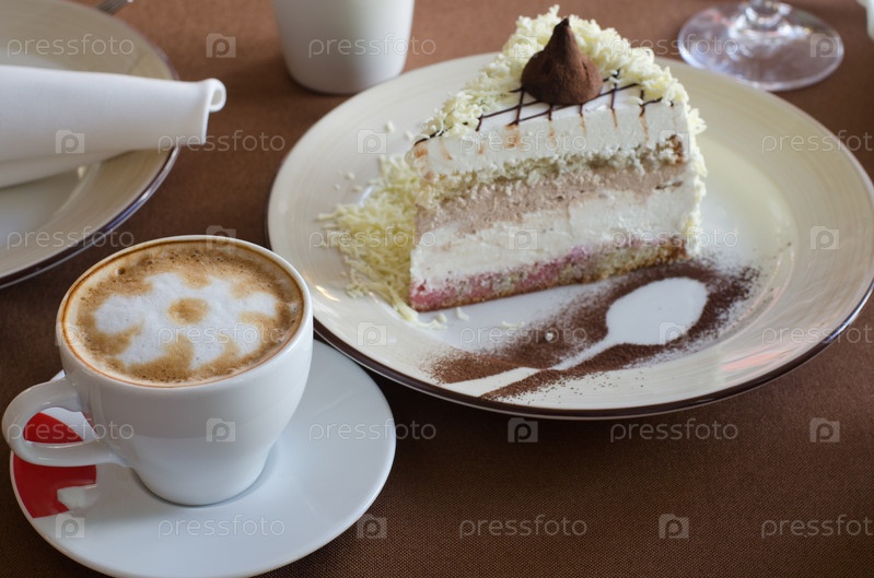 Торт на тарелке и кофе