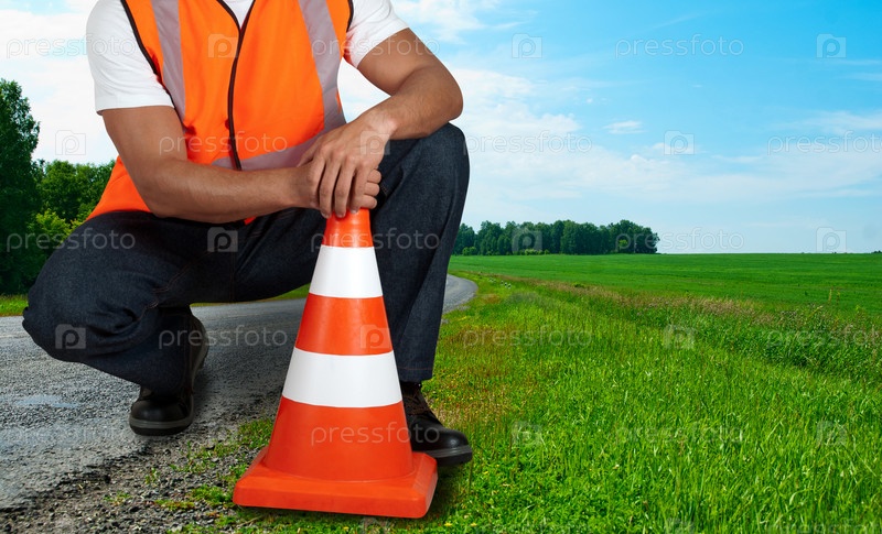 Дорожный рабочий с оранжевым конусом на обочине