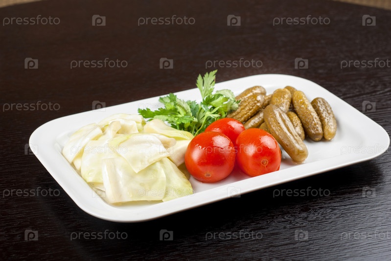 Маринованные овощи: помидоры, огурцы, капуста на белой тарелке