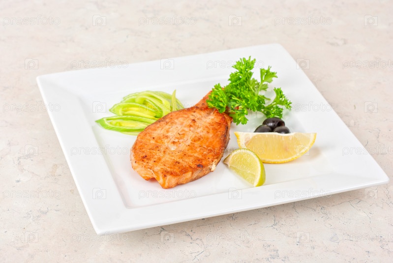 Стейк из лосося с зеленью, луком, лимоном, лаймом и оливками