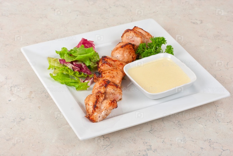Жареная курица кебаб с соусом и зеленью на белой тарелке
