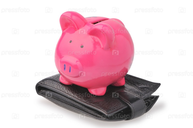 Розовая свинка-копилка на бумажнике, белый фон