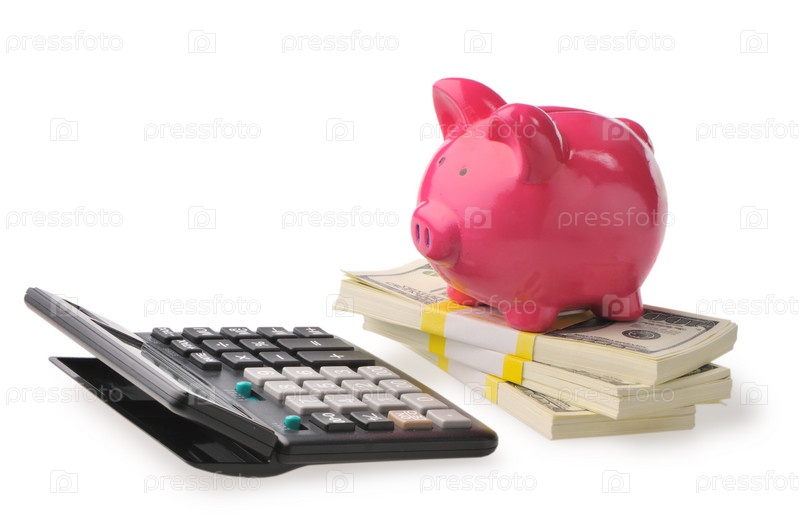 Розовая свинка-копилка и пачки американских долларов на белом фоне