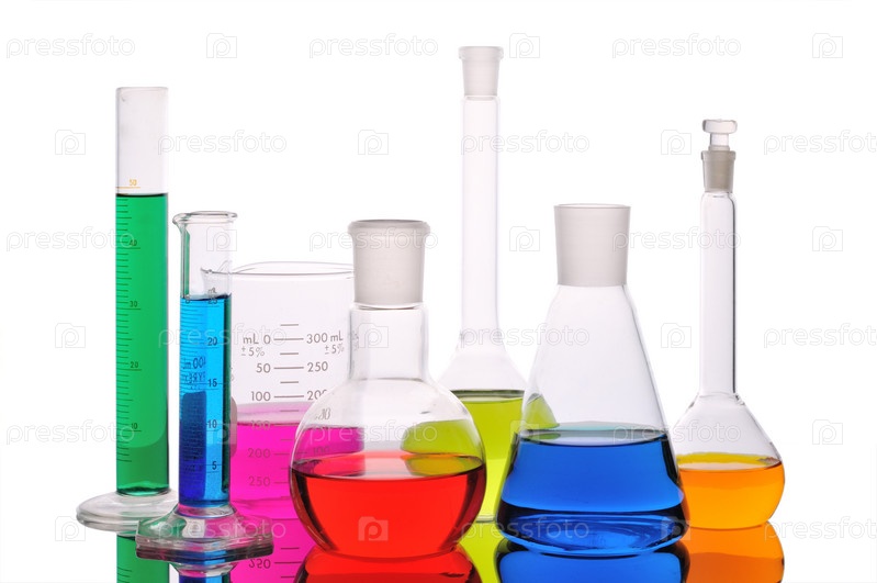 Лабораторные колбы и мензурки на белом фоне