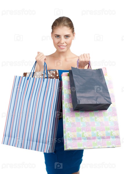 Счастливая красивая девушка с разноцветными пакетами в руках после шопинга