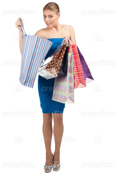 Счастливая красивая девушка с разноцветными пакетами в руках после шопинга