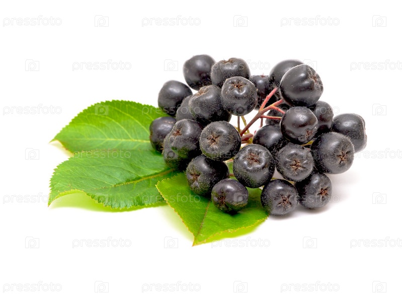 Гроздь черноплодной рябины на зеленых листьях на белом фоне