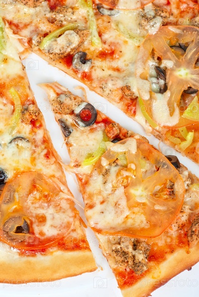 Пицца с лососем, креветками, помидорами, перцем, оливками и сыром моцарелла на белом фоне