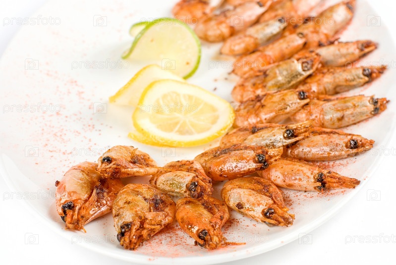 Жареные креветки с лимоном крупным планом