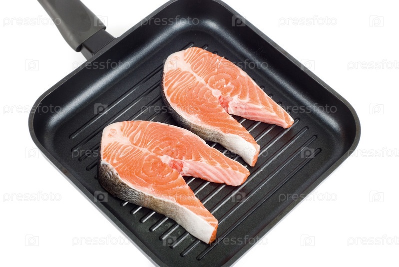 Два куска красной рыбы на сковороде, изолировано на белом