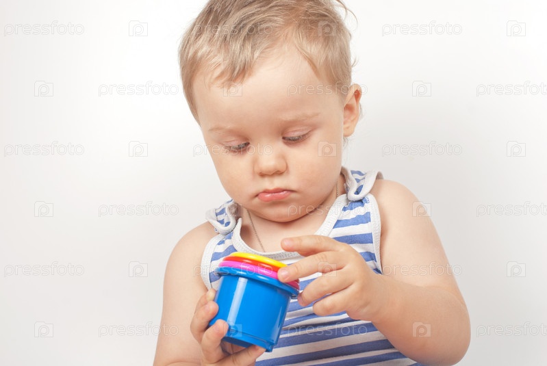 Маленький мальчик играет с игрушкой на белом фоне