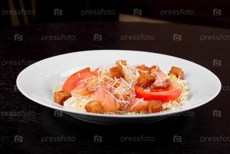 Салат из пекинской капусты, помидоров, чесночных сухариков, пармезана, соуса и копченого лосося