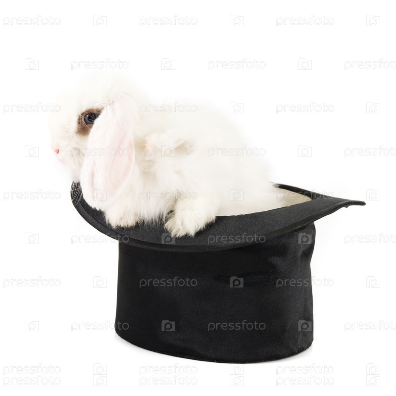Маленький кролик в черной шляпе на белом фоне